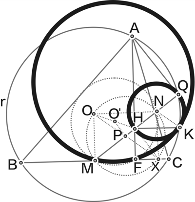 在銳角三角形ABC中,AB>AC,設(shè)r是它的外接圓,H是它的垂心,F(xiàn)是由頂點(diǎn)A處所引高的垂足,M是邊BC的中點(diǎn),Q是r上的一點(diǎn),使得∠HQA=90°。K是r上的一點(diǎn),使得∠HKQ=90°。已知點(diǎn)A、B、C、K、Q互不相同,且按此順序排列在r上,證明:三角形KQH的外接圓和三角形FKM的外接圓相切。