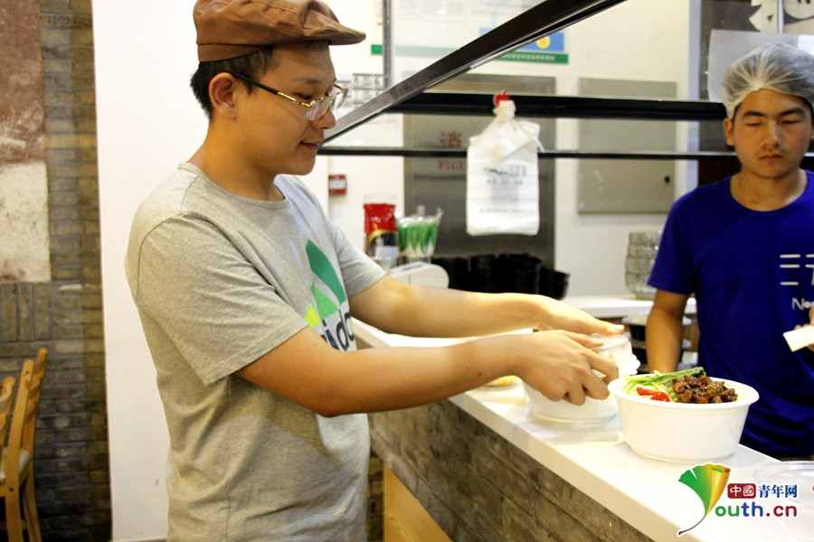 準備食材、切配、為午飯高峰做準備,飯點過后添置原材料,晚上打掃整理打烊。面館開業頭四個月里三人每天只能睡三個小時,正是在大家的共同努力下,小店第一個月的收入高達30萬元。中國青年網記者 王婧 攝