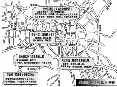 北大門區(qū)域的品牌火鍋最為集中,成都的譚魚頭、光頭香辣蟹火鍋,重慶的小天鵝、兩江樓檔次高、口感好、環(huán)境好、服務好。此外,這個區(qū)域的酒樓風格最豐富,乙古香酒樓(滇味精品家宴)、粵海漁村(老牌平價海鮮酒樓)、酒靈莊(騰沖風味)、東北人家(東北風味)等等,不同的風味,可讓你吃不膩。10人桌收費標準視實際菜品確定,人均消費30-80元。