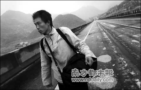 他的女朋友回家途中被困在湖南株洲,而且生病了,兩天前,他決定從深圳出發,前往株洲照顧她。昨天下午2時許,記者在京珠高速公路隧道遇見這個24歲的打工仔時,他的頭上頂著雨珠,臉凍得通紅,褲腿都被雨水打濕了。他背著一個包,挎著一個包,但身上已經沒有吃的了。