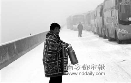 一名男子頭上披著一床紅色的毛毯,胸前掛著一床棉被,手上拎著一個熱水瓶,一步一滑,在結冰的京珠高速路上艱難行走著。