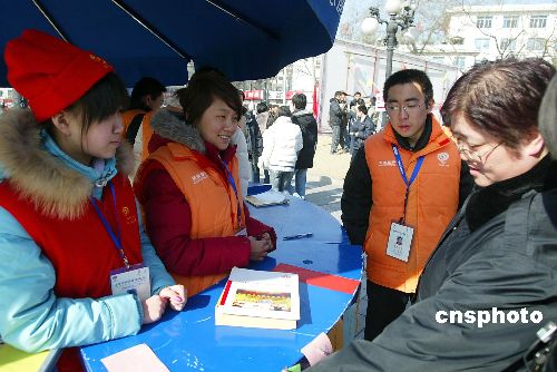 2月9日,農(nóng)歷大年初三,北京奧運會志愿者工作協(xié)調(diào)小組辦公室、團市委、北京志愿者協(xié)會在全市開展北京奧運會城市志愿者"春節(jié)服務(wù)周"城市志愿服務(wù)活動。在這期間將有一萬余名城市志愿者在全市重要交通樞紐、商業(yè)網(wǎng)點、旅游景點、餐飲住宿等地設(shè)立的100個城市志愿服務(wù)站點,為公眾提供信息咨詢、應(yīng)急服務(wù)和語言翻譯等志愿服務(wù)。 中新社發(fā) 富田 攝
