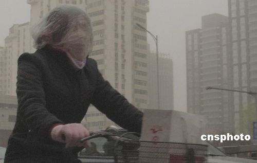 2008年3月18日上午,中國北方春季首場重度揚沙浮塵天氣降臨北京。在北京西城區阜成門街頭女士戴紗巾騎乘單車。 中新社發 鄒憲 攝