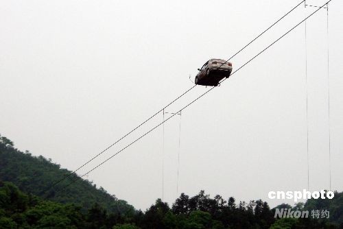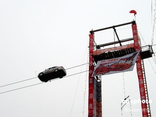 4月27日,被稱為“中國車王”的河南漢子劉鎖柱,在湖南平江縣駕駛著一輛未經改裝的普通小汽車,在距汨羅江45米的高空上,沿著兩根鋼絲鋪成的“天路”成功行駛了230米。據介紹,這個距離目前為“中國之最”。 中新社發 鄧霞 攝