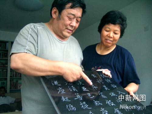 圖為楊軍(左)與妻子董桂榮一起欣賞雕刻作品。(閆盛霆/攝影)