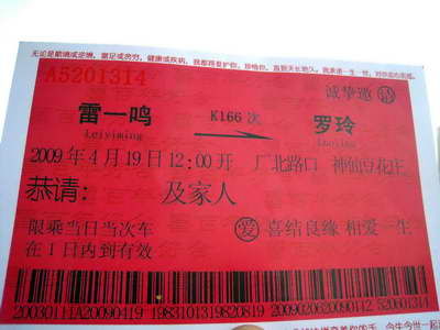 中午11時多,來賓們先后到達婚禮現場,每個人手里都拿著一張“火車票”,仔細一看,這可不是普通的火車票,而是新郎雷一鳴為婚禮專門設計制作的請柬。請柬有一張明信片大小,被設計成“火車票”樣式,正面“百年好合”的紅底上印有“雷一鳴”至“羅玲”和“K166次”等幾個黑體大字,主要內容是恭請來賓前往“廠北路口**豆花莊”參加兩人的婚禮,并且“限乘當日當次車,在一日內到有效”。
