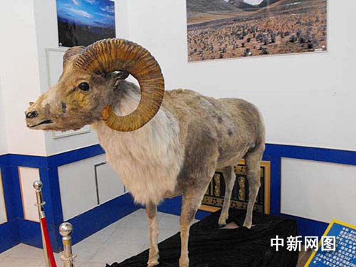 阿克塞哈薩克族自治縣縣委宣傳部熱提劍今日向記者介紹,該縣展覽館陳列的盤羊標本是國家二級保護動物,屬?浦畜w型最大的一種,棲息于海拔2000——5000的沙漠和山地交界的沖擊平原和山地低溝中。雄性角粗大,由頭頂向下并向后螺旋狀彎曲,幾乎可達360度,主要分布在阿克塞哈薩克族自治縣境內于大、小哈爾騰前山和安南壩地區。