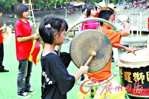 這名女孩名叫苗苗,今年7歲,在南海一間小學(xué)讀二年級。昨天下午5時,在西樵山天湖公園水上擂臺,近10支獅隊輪番上樁演練。在這些獅隊隊員當(dāng)中,有名小女孩特別引人注目。她身穿黑色練功服,扎著2條小辮子,有板有眼敲著銅鑼。這名女孩就是苗苗,在所有參賽獅王爭霸隊員中年紀(jì)最小。