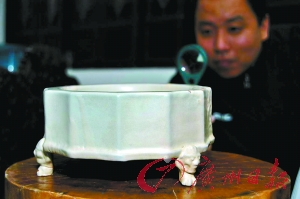 昨日下午,得到藏家羅先生特許,本報記者按要求獨家拍攝了這件汝窯,并探尋了其中三大傳奇之處,“目前來說因為是孤品,為了防止仿造,我們禁止任何拍攝,廣州日報拍攝的圖片,是第一張。”潘館長說道。