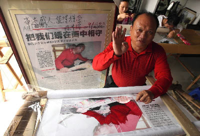 就這樣,吳耀存開始了他人生的第二次創(chuàng)業(yè)。一有時間,吳耀存就去看妻子,為妻子擦洗身體,向妻子匯報湘繡作坊的經(jīng)營情況。2006年5月6日,奇跡出現(xiàn)了,妻子竟然有了意識。“那天,我又像往常一樣向妻匯報湘繡作坊的情況時,妻子竟睜開了雙眼,并哭出了聲,當時,我激動得抱著妻子大哭了一場。”昨日,當吳耀存說起3年前的這一幕時,這個大男人又流下了熱淚。