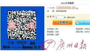 淘寶上,有賣“方舟船票”的,有賣“方舟直達(dá)解放牌貨車車票”的,有用谷歌地圖追尋方舟在地球上的停靠點(diǎn)的。一名網(wǎng)友1000萬元叫賣“方舟船票”最為火熱,不少網(wǎng)友回帖詢問能否打折、如何鑒別真?zhèn)危有詢問有否包含災(zāi)難后重建送指定城市戶口。