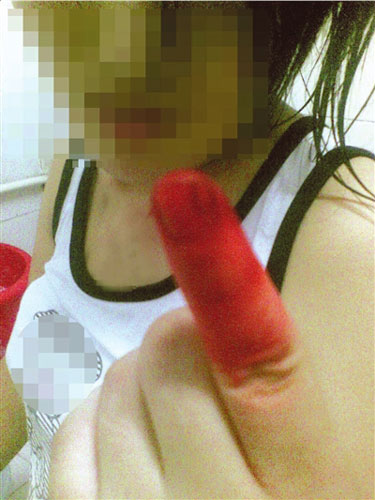 一名工友展示她受傷的手指。