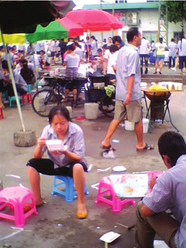 工作之余,工友們在外面小吃攤吃飯。