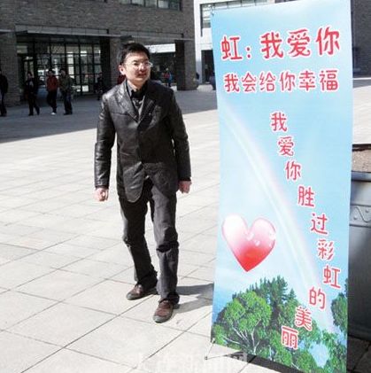 這捧愛的玫瑰是在昨日上午11時許出現在軟件園16號樓天井廣場內的,一張一人多高的POP海報書寫著愛的誓言:“虹:我愛你,我會給你幸福”、“我愛你勝過彩虹的美麗”。求愛的男青年站在海報旁,他說希望他所愛的虹透過辦公室明亮的玻璃窗看到他的時候,能夠立刻來到他的面前,然而他等了半個小時也沒見到虹,而是樓上樓下、樓內樓外數百雙好奇的眼睛。記者聽到了很多猜測的聲音,“這么長時間沒出現,說不定人家已經決定拒絕了。”“太興師動眾了,全公司的人都看著,換作我還真有些不好意思出來呢。”“要是我的男朋友,我希望他坐著熱氣球來跟我求愛。”“讓我們慢慢等待,沒準就會出現出其不意的浪漫。”
