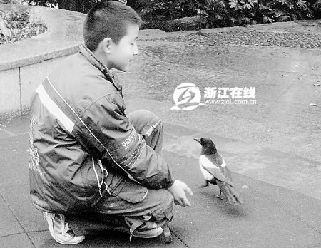 前天,他和爸爸媽媽一起到家附近的半山公園玩。中午12點多,他們來到半山腰的翠峰閣,突然飛來一只喜鵲,代媽媽順手用相機給聚林和喜鵲合了張影。可沒想到,拍完照,喜鵲竟然不肯走了,整個下午,喜鵲就圍著代聚林轉。