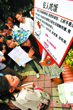 “我是乙肝病毒攜帶者,我想告訴您:乙肝不是消化道傳染病,不會通過共餐等日常生活接觸傳播,有人不敢與我共餐,甚至包括我的家人,F征人一起吃飯,我請客,您吃飯!弊蛉,廣州購書中心門前,一名女孩高舉著這樣一塊牌子要征人一起吃飯。女孩的網名叫鋤草,是一名留日海歸,跟網友成立了“鋤草”科普組織,專門進行乙肝科普活動。