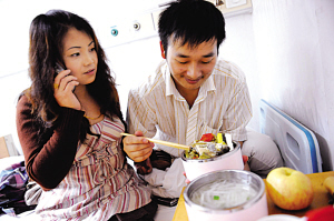 病房里,在女友的陪伴下,馮金松胃口大開(kāi)。范曉林?jǐn)z(圖片來(lái)源:揚(yáng)子晚報(bào))