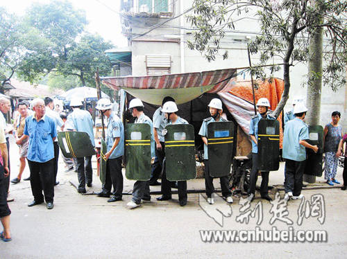 28日,洪山區關山街組織城管隊員,首嘗“鐵桶陣執法”,讓盤踞社區近半年的“釘子戶”挪了窩。