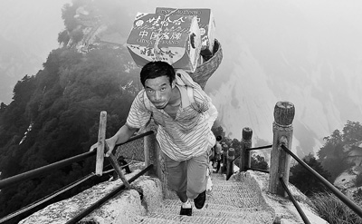 他從一個老鄉的口中,第一次聽說背夫這個詞。雖然何天武從沒有去過華山,并且只有一條胳膊,但他沒有半點猶豫,因為他覺得終于找到了適合自己的一份工作。他選擇了北上華山,開始了背夫生涯。