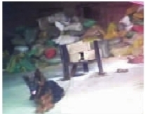 大狼狗守門,后面堆放的是黃豆。記者實(shí)地暗訪后看到的情景。記者 李丹 攝(非正常拍攝)