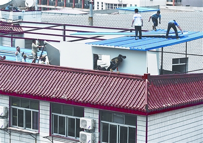 搭個鐵架、插上泡沫板,一夜之間就能建起一間房,這樣的“速生違建”目前成為武漢市“種房”一族研發出的新品種。昨日,記者看到,一長溜白藍相間的這種泡沫違建,就“長”在江漢區黨校路中商平價超市旁一棟五層樓的城市客棧樓頂。
