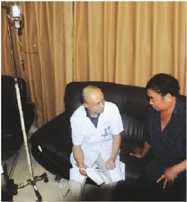 8月19日,湘雅三醫院,戴英波正在吊吊瓶,一名患者過來向他咨詢病情。記者 龔磊 攝