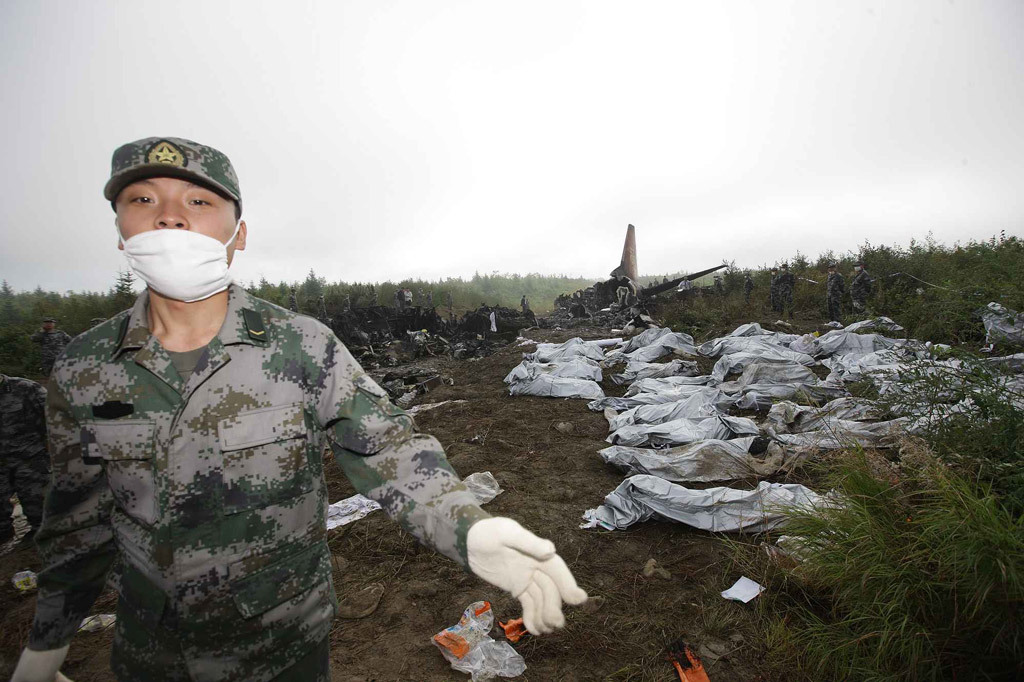8月25日,黑龍江伊春飛機失事現場,遇難者的遺體已經收集到了一起。