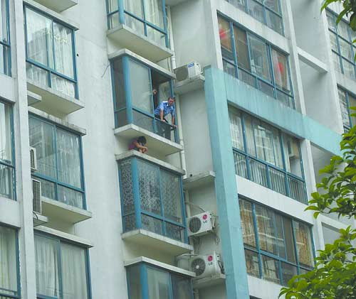 8月29日上午,臨桂縣城金水灣·境界小區內,一女子突然爬到三樓窗臺下的石板上,躲在兩個窗臺之間狹小的空隙里,玩起了“躲貓貓”,嚇壞了小區內的居民。經過一個多小時的勸說,公安和消防才將女子安全救出。
