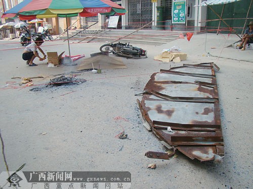 1日下午4時(shí)許,記者來(lái)到沙陂鎮(zhèn)街上,只見(jiàn)郵政儲(chǔ)蓄所沙陂營(yíng)業(yè)廳門(mén)前停放著一具尸體,一張席子遮蓋在上面。旁邊有一塊鐵板和一輛翻倒的摩托車(chē),地上擺放著紙錢(qián)、香等祭品。該廳的樓頂上安裝有一個(gè)信號(hào)發(fā)射塔,塔的周?chē)袔讉(gè)用鐵板做成的平臺(tái),最下面那個(gè)大平臺(tái)缺了一塊鐵板。