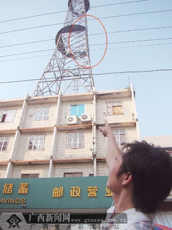 信號(hào)發(fā)射塔上的其中一個(gè)平臺(tái)缺了一部分(畫(huà)圈處)。記者 趙敏攝