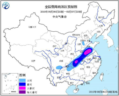 據中國氣象局網站報道,6日,中國黃河流域到長江流域之間的大部分地區出現明顯降雨天氣。預計,6日夜間到7日白天,河南、安徽、江蘇及湖北局地將有大暴雨。