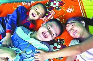 18年前,大兒子談又銘出生。“1歲不會站,2歲不說話,3歲時到重醫附屬兒童醫院檢查,是腦癱、腦萎縮。”5歲之前,談又銘不能自己吃飯,10歲之前不能行走。“他長大了,我們都抱不起來他,全靠在地上爬。”在談又銘6歲的時候,妹妹談泳每出生了。兩個孩子從小就在一起,哥哥智力不好,說話不清楚,只有談泳每聽得懂。