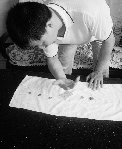 說起砸杏核,是在朋友聚會中,因朋友的一句玩笑話而使他對砸杏核產生了興趣。談話中,張太為記者當場展示了這個高難度的絕活。只見他將杏核放在鋪平的白毛巾上,排成一字型。運氣、調整呼吸、伸出右手、擺好手勢,只聽“哈”的一聲,使勁往下一拍,“啪”,杏核均勻地裂開了。隨后,又是啪啪的幾聲,幾個杏核已經成碎渣了。記者取了兩個杏核想試試,摸了摸才發現,杏核很堅硬,并且體積非常小,常人很難拍碎。記者粗略算了一下,一分鐘內張先生砸碎了十多個杏核。因為手上有傷,為了防止杏核將手背動脈劃破,他只好暫時停止。據張先生講,在正常情況下,他能拍碎30多個杏核、100多個核桃。(記者 孫建榮 實 習 生 曹明娟 濮潔瓊 魏雅晴 文/圖)