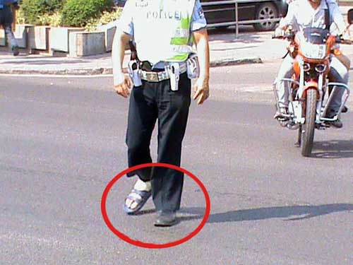 腳腫得這么厲害,還在堅持工作,網友心里“佩服慘了”。他用照片記錄下了這一幕,并發到網上。照片中的交巡警右腳腳踝處綁著厚厚的繃帶,腳上穿著拖鞋,全身的力量仿佛僅能依靠左腳支撐,在烈日下一絲不茍的指揮著交通。