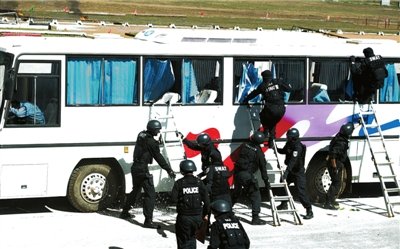 昨天上午,在京郊懷柔某訓練場內,市公安局巡特警總隊首次聯合武警特警舉行反恐處突聯合實戰演練,北京特警精銳“藍劍突擊隊”和北京武警總隊國家級反恐力量“雪豹突擊隊”同時亮相。演練中共出動特警隊員400余人,大量反恐特種裝備同時亮相。警方還特別針對菲律賓武裝劫持大巴車事件進行了反劫持演練。