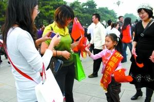 “看看,是個(gè)小志愿者,那么小就有愛心呀!”許多游客看到小女孩送國旗,紛紛贊嘆駐足觀看,多人爭著和小女孩合影。