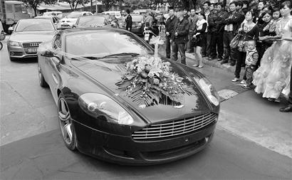 “來了,來了!”中午12時(shí)許,長長的車隊(duì)從遠(yuǎn)處駛來,前面的黑色婚車竟是價(jià)值470萬元的阿斯頓馬丁!但新郎新娘卻沒有按傳統(tǒng)“躲”在豪車?yán)铮钦驹诹似浜笤鷿M了粉色蓮花、長七八米的花車上!接著,15輛奔馳車緩緩經(jīng)過紅地毯,看得眾人眼睛發(fā)直。