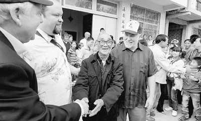 10月17日,湖北省監利縣周老嘴鎮羅家村,當年參與營救本尼達的農民周孝漢(前排右二)來到現場,本尼達的兒子愛德華(左一)上前熱情地握住他的手表示感謝。