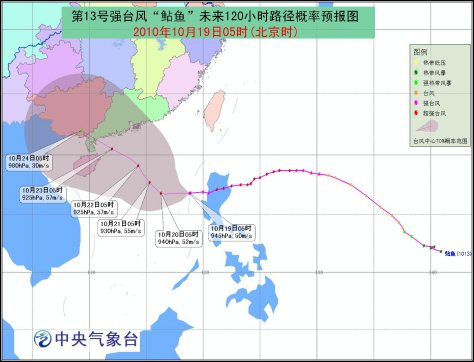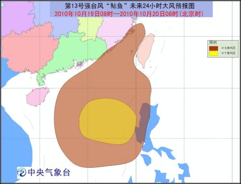 今年第13號超強臺風“鲇魚”已于10月18日20時在菲律賓呂宋島北部減弱為強臺風,18日22時前后進入南海東部海面。19日05時強臺風“鲇魚”的中心位于南海東部海面上,就是北緯16.8度,東經118.8度,中心附近最大風力有15級(50米/秒),中心最低氣壓為945百帕。