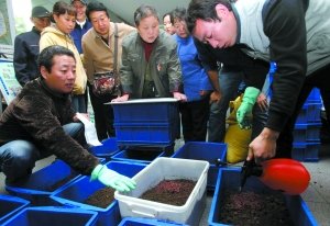 昨日,在東四七條居委會,前來領(lǐng)蚯蚓的居民圍在11個塑料儲物箱邊,民間環(huán)保組織地球村的工作人員張強戴著手套,一邊給每一只箱子配泥土和定量的蚯蚓,一邊給大家講解養(yǎng)殖蚯蚓的事項,“菜葉、果皮薄薄鋪一層即可,一天不要超過一公斤,最后用土蓋上”。