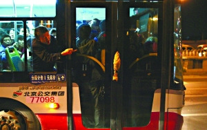 阿蘭(化名)是六里橋北里附近一名交通協管員,從2007年開始,她就在這里負責維持交通秩序。揮動小旗,右手推著乘客的背,配合著關門的節奏,順勢將乘客推上公交車。三年來,阿蘭每天早晨都要不停地重復這套動作,尤其是對擠300路、323路和661路車的乘客。