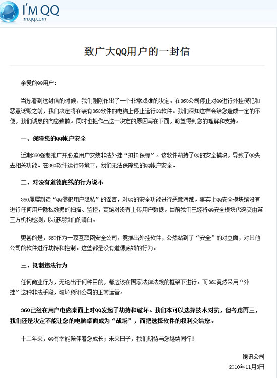 11月3日下午,騰訊向其用戶發(fā)布消息稱,將在裝有360軟件的電腦上停止運行QQ軟件。