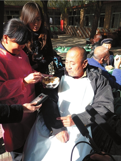 幾分鐘后,護工將飯菜端過來。因孫萬祥生活不能自理,一名護工喂他吃飯。剛吃了幾口,他就開始咳,臉憋得通紅,護工趕忙拍了拍他的后背,但吃下的飯菜還是吐了出來!八,水”,他吐字不清地喊道,隨后他拒絕進食。