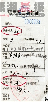 當事醫生隨后被叫來與家屬見面,這位左醫生說,死者原本是另一位肖姓醫生的病人,當時死者家屬等了很久,但肖醫生一直很忙,便叫他代開證明,“證明一共有三聯,一聯是給醫院的存根,一聯給派出所銷戶口,另一聯給殯儀館。我們查過,存根那一聯沒寫錯!