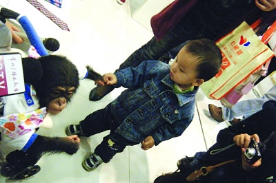 一個小朋友上前和小猩猩握手。 戰斗攝