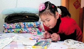 丁莎莎趴在她的小床上畫畫。新華社發