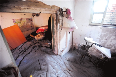 昨天中午,記者在楊先生家中看到,遭“泥封”的房屋約15平方米,里屋的泥漿高約1米,通過房門涌入外屋。已凝固的泥漿表面光滑,有些地方開裂。