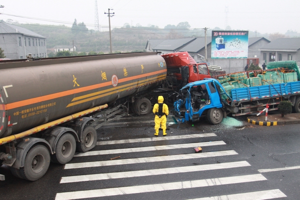 車禍發(fā)生在當(dāng)?shù)?20國(guó)道安仁鋪村路口,相撞的三輛車分別是滿載30噸乙丙胺的槽罐車、滿載水泥的卡車和裝載玻璃的拖拉機(jī),事故造成其中2名駕駛員受傷、槽罐車內(nèi)乙丙胺泄漏。