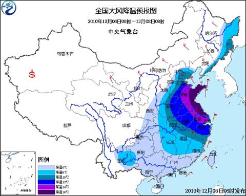 中央氣象臺2010年12月6日06時繼續發布寒潮藍色預警:預計,12月6日08時至8日08時,陜西東南部、華北中南部和東部、東北東部、黃淮、江淮、江漢、江南、華南及貴州、云南東部、重慶等地將出現6~10℃降溫,其中,華北東南部、黃淮、江淮、江南東北部等地的部分地區降溫幅度可達12~16℃;淮河以北大部地區有5~6級偏北風,江淮、江南有4~5級偏北風。