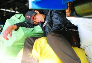 快遞業務激增,工人每天加班加點,累了只能在倉庫里小睡一會兒。攝影記者 胡元勇